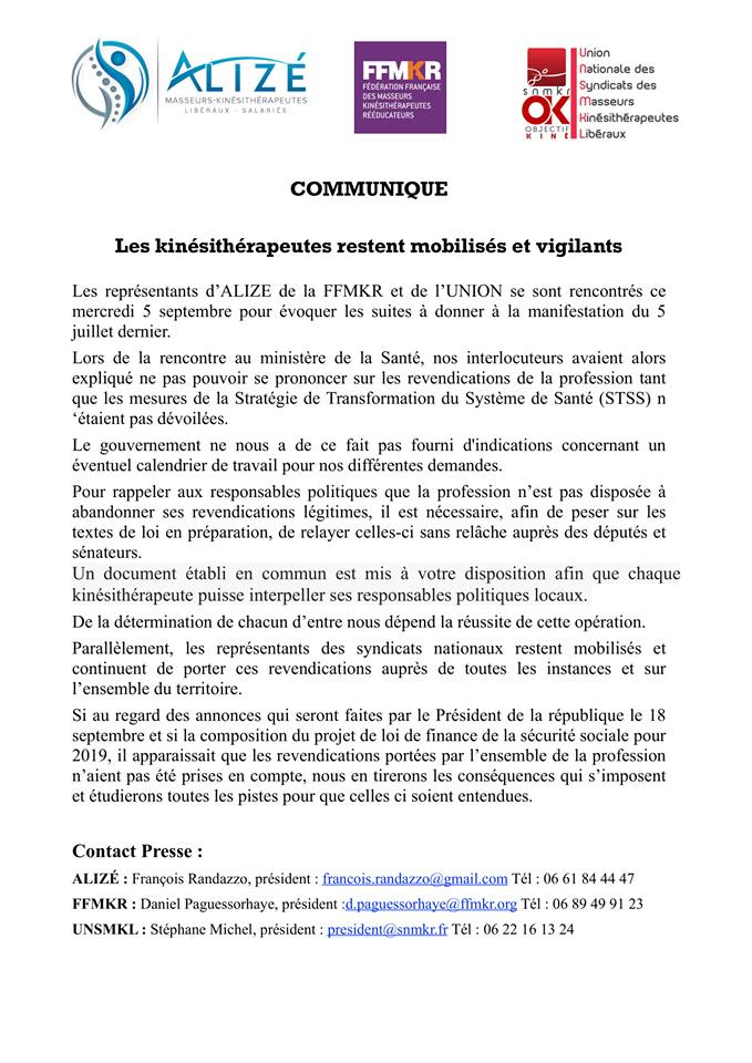 Alizé, la FFKMR et le SNMKR se sont réunis le mercredi 5 septembre afin d’échanger sur la suite à donner au mouvement du 5 Juillet. Un communiqué commun a été rédigé.