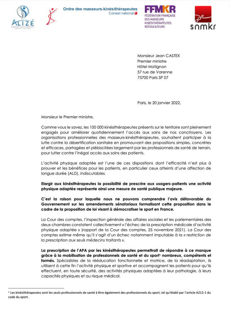 La proposition de loi « Démocratiser le sport en France » est actuellement en cours d'examen. Lors de son passage au Sénat il a été déposé un amendement proposant de permettre aux kinésithérapeutes de prescrire de l’Activité Physique Adaptée aux patients atteints d’une ALD. Le Gouvernement a émis un avis défavorable et l'amendement en question a été rejeté.